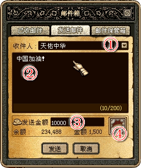 发送信件时,输入收件人ID、道具或金币后就可以发送。