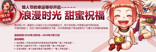 践行三生之约,共造恒美爱情,DNF为所有恋人玩家们推出最浪漫的情人节活动,所有DNF玩家登陆活动页面领取“情人节幸运箱”,打开宝箱有机会获得“遗忘河水滴”、“远古精灵的秘药”、“魔界抗疲劳秘药”、“幸运巧克力”、“寒冰虎压缩胶囊”、“蓝章鱼压缩胶囊”等惊喜好礼!