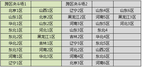 3、同时为了缓解服务器压力,本次维护后网通区的跨区决斗场将重新划分,划分区域以下表为准,麻烦各位勇士相互转告。