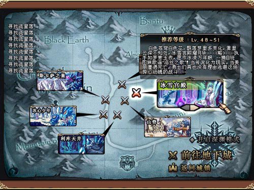 万年雪山地区追加第5、第6地下城,分别为“冰雪宫殿”&“斯卡萨之巢”,为高级玩家冒险旅程打开了全新的一页。“冰雪宫殿”进入条件为45级,推荐等级50级,其副本内的BOSS为冰雪女王洛丝,虽然无法从宝座上移动,但可以命令部下或使用魔法战斗,是位相当难缠的BOSS。“斯卡萨之巢”进入条件为50级,推荐等级55级,万年雪山山顶的斯卡萨之巢的周围,密集着守护斯卡萨之巢的怪物,斯劳特/图卢斯族的战士们/斯卡萨幼龙等怪物们守护着通向斯卡萨的路段,斯卡萨在山顶上注视着入侵者,并找机会用龙息阻碍入侵者的前进,斯卡萨身材巨大且攻击力极强,前往的勇士们可要小心了。